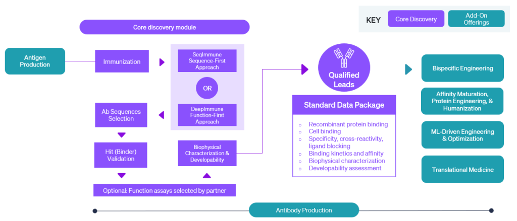 SeqImmune™: This method begins by capturing a broad range of antibodies from the immune repertoire and then narrows down the selection to identify the desired lead. It prioritizes initial diversity of hits and relies on subsequent assays and iterative analysis of the immune repertoire. SeqImmune™ is especially useful when dealing with therapeutic targets lacking initial screening assays or benchmarks, making it suitable for exploratory programs.